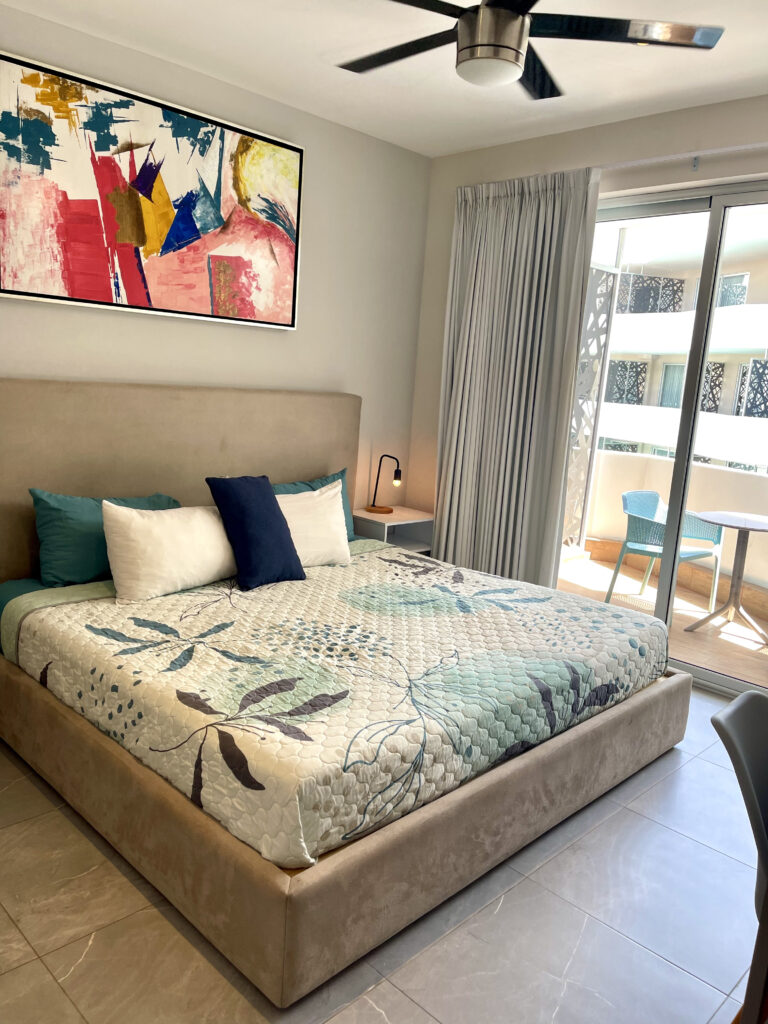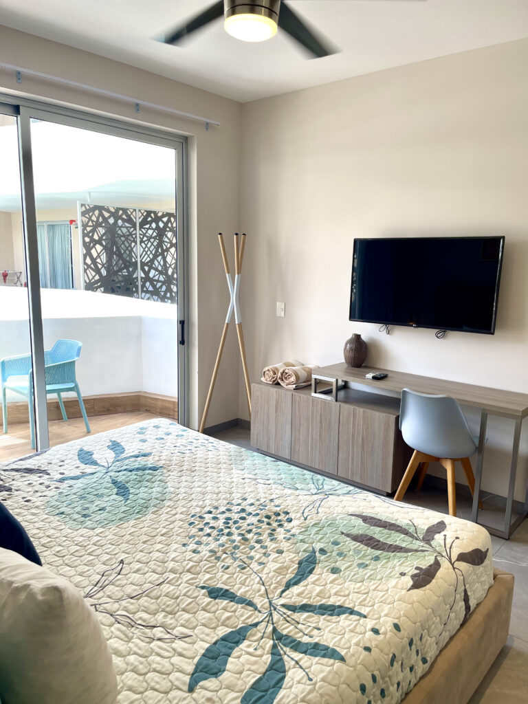 The studio features an open and functional design, providing everything you need for a comfortable stay. It includes a fully equipped kitchen, a full bathroom, a Smart TV, and a cozy workspace. The spacious king-size bed ensures a restful night’s sleep, while the private balcony, overlooking the condo’s large swimming pool, lets you enjoy the tropical breeze and the relaxed atmosphere of Playa del Carmen.