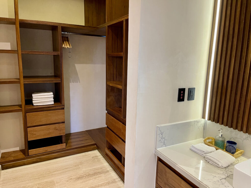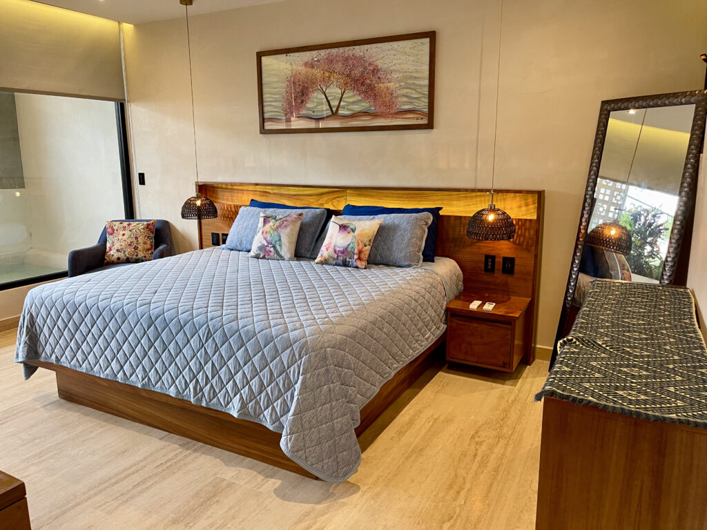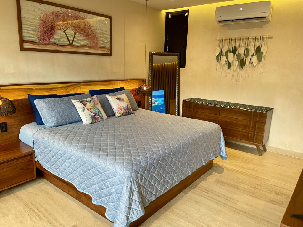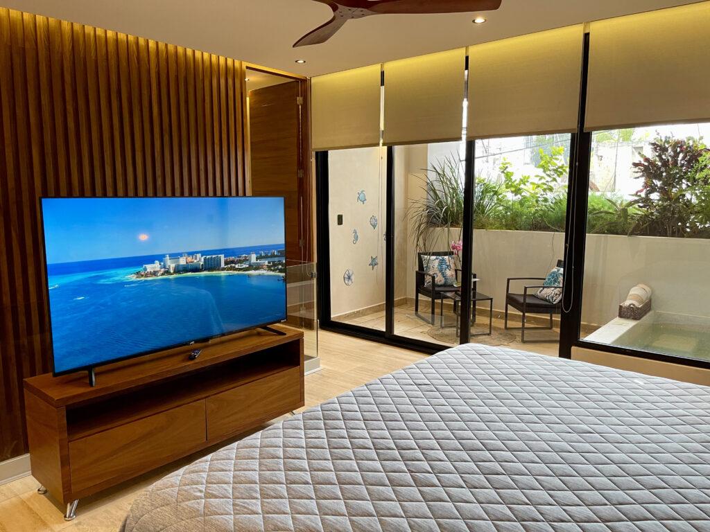 Heading up the elegant interior staircase, you’ll arrive at the bedroom, featuring a king-size bed, air conditioning, a ceiling fan, and a private bathroom with a walk-in closet. From here, you’ll have access to a private balcony where you can unwind in your plunge pool, ideal for taking in the tropical breeze of Playa del Carmen.