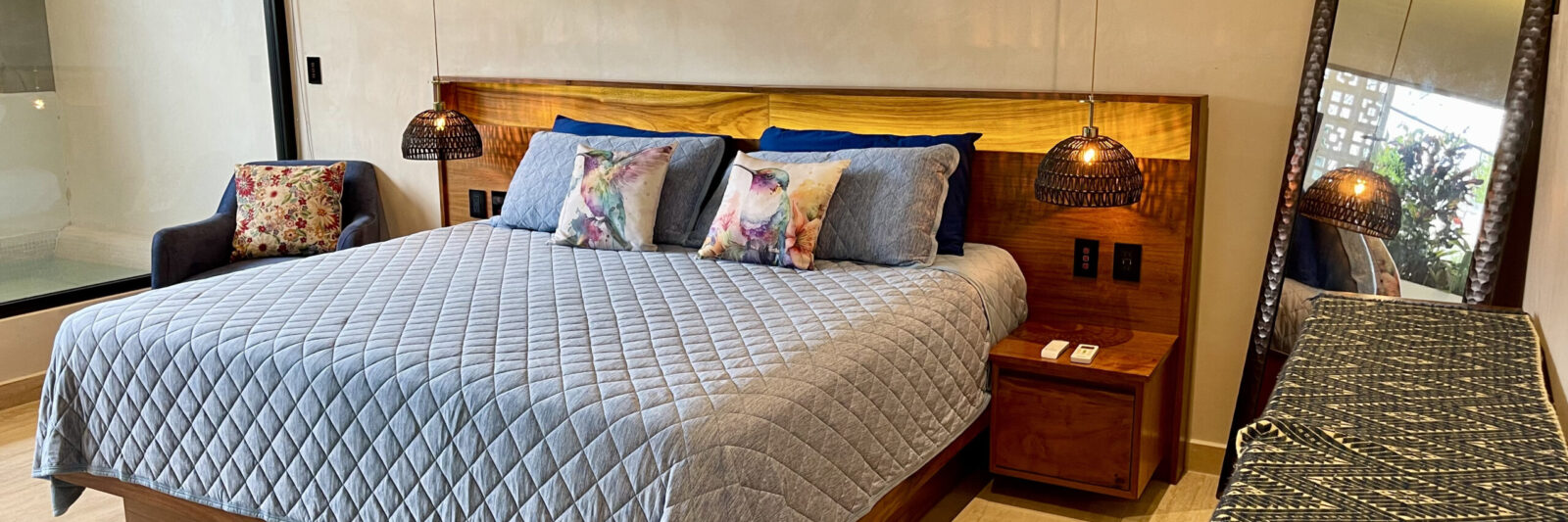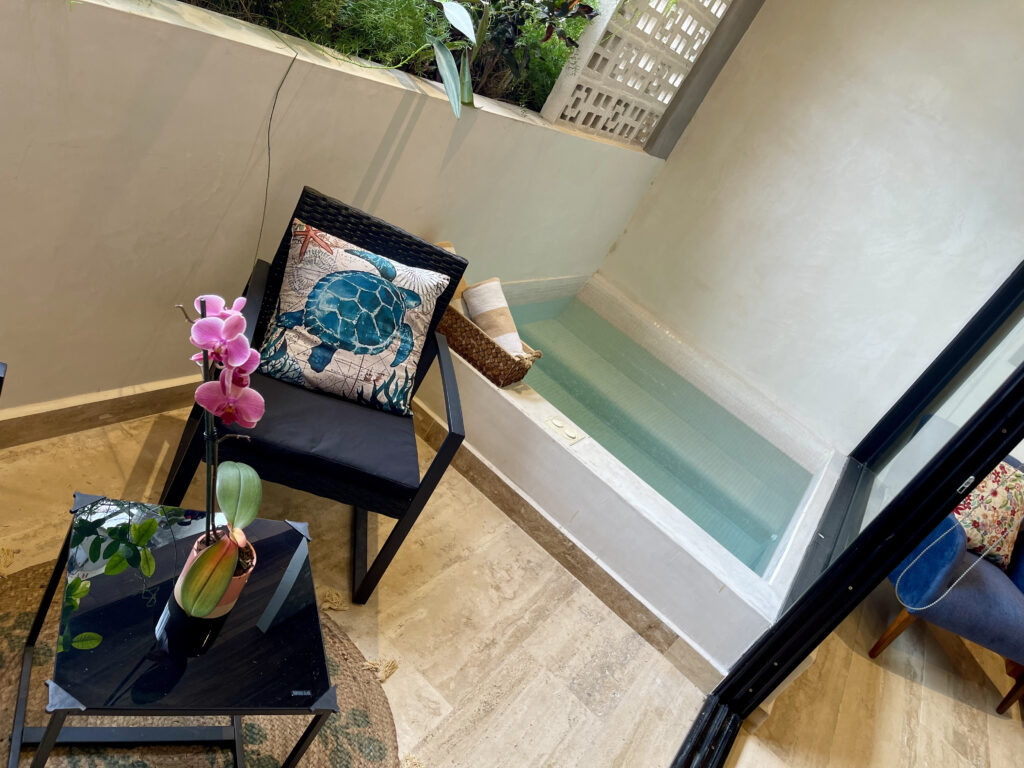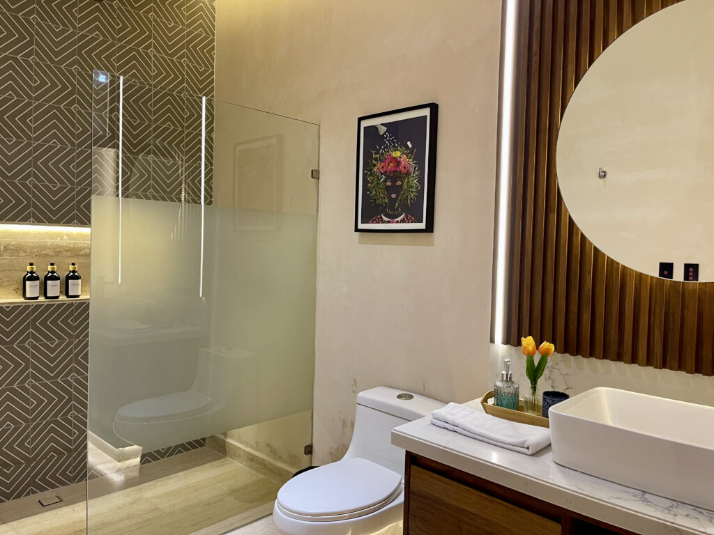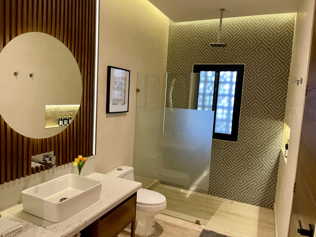 Heading up the elegant interior staircase, you’ll arrive at the bedroom, featuring a king-size bed, air conditioning, a ceiling fan, and a private bathroom with a walk-in closet. From here, you’ll have access to a private balcony where you can unwind in your plunge pool, ideal for taking in the tropical breeze of Playa del Carmen.