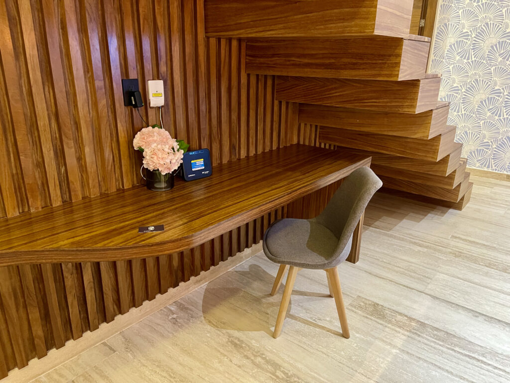 Upon entering this two-story loft, you’ll find yourself in the spacious open-plan kitchen, dining, and living area. The kitchen is fully equipped with high-end appliances, including a refrigerator, stove, and microwave. The living area features a comfortable sofa bed and a Smart TV, perfect for relaxation. This level also includes a working area and a full bathroom, adding convenience for additional guests. The entire ground floor is air-conditioned for your comfort.