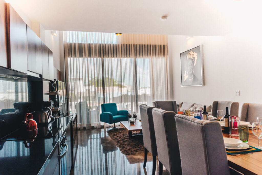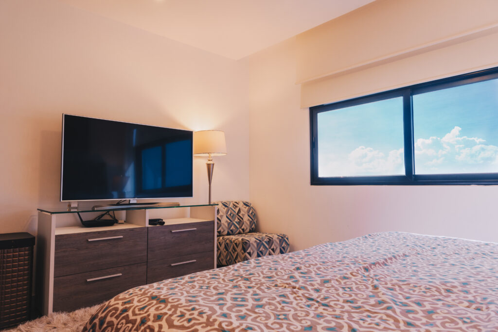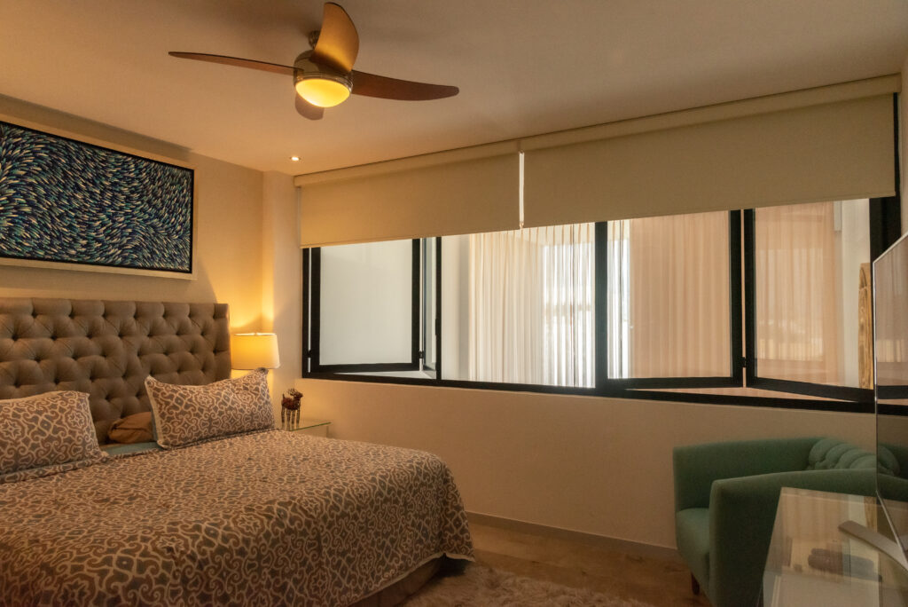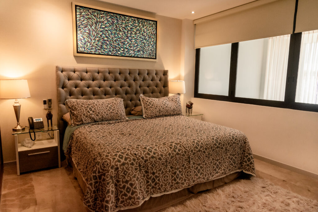 Upon entering the apartment, located on the 4th floor, you will have access to the kitchen/dining room and living room area, all fully equipped with top brand luxury appliances (LG double door refrigerator with ice and water dispenser, electric oven and stove , LG microwave with grill, 75″ SuperHD Samsung SmartTV, table and service for 8 people. You can also relax in an exclusive seating area on the balcony, overlooking 5th Avenue. This floor is completed with the laundry center ( large capacity washer/dryer with TwinWash LG system) and a service bathroom.Through a staircase you will find access to the second level, where the 3 bedrooms with private bathrooms, closets, top quality KingSize beds are located so that you can you can relax or recover energy, SmartTV SUHD 55 “, telephones and safes. The first room has a large window overlooking the room that is in the lower part, and this window is protected view of roller blind with blackout with motorized system. A long corridor will connect you, first, with the second room, this one has a window with a view of the open and green spaces of the condominium, said window has manual roller blinds with and without blackout, and finally the third room from which you will be able to contemplate the beautiful turquoise tones of the Caribbean Sea and at night, if you wish to obtain privacy you can also unfold your manual roller blinds with and without blackout. Finally, continuing down the same staircase, one floor higher you will find the private terrace, where you can enjoy with your family and friends using the heated pool (hot/cold), sunbathe on the loungers, eat at the table with spaces for 6 guests, watch satellite television on a SmartTV SUHD 55″. This space has another service bathroom to avoid the circulation of people in other areas.