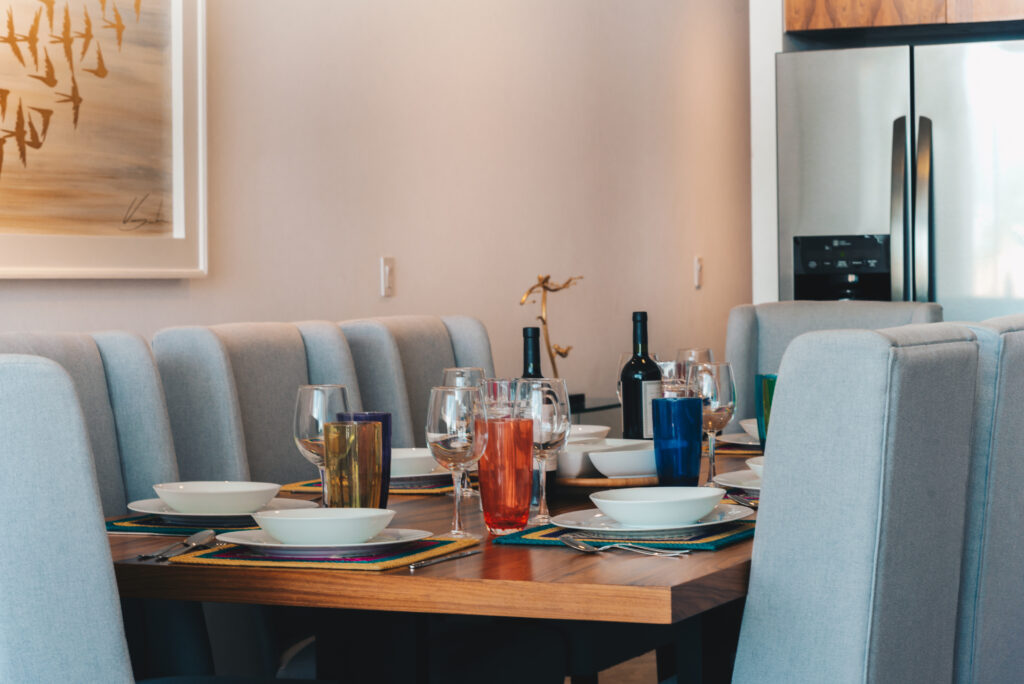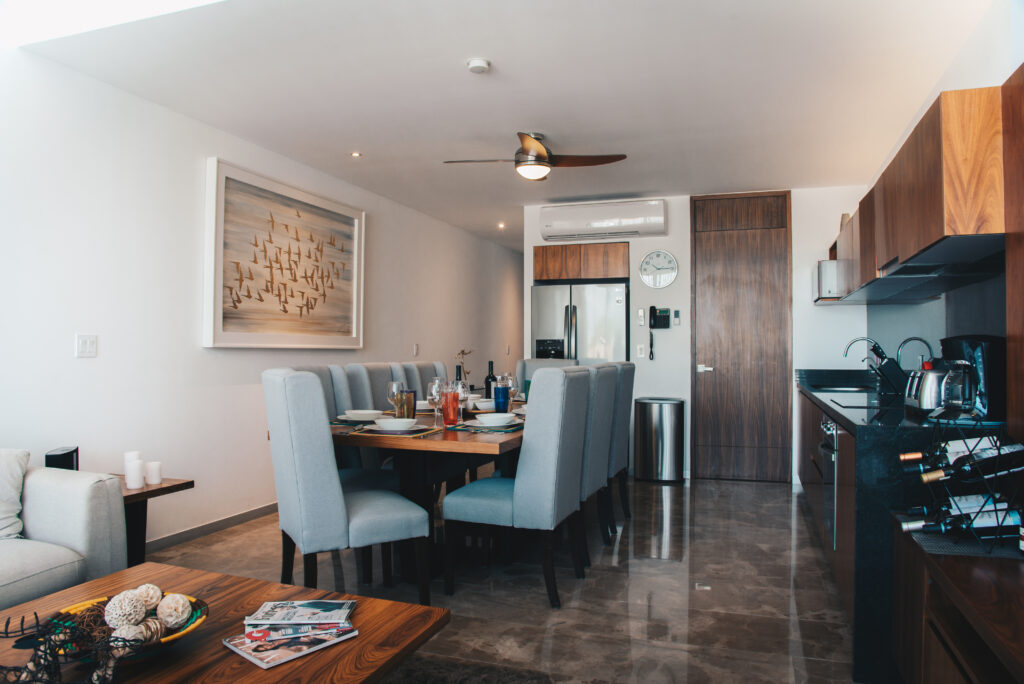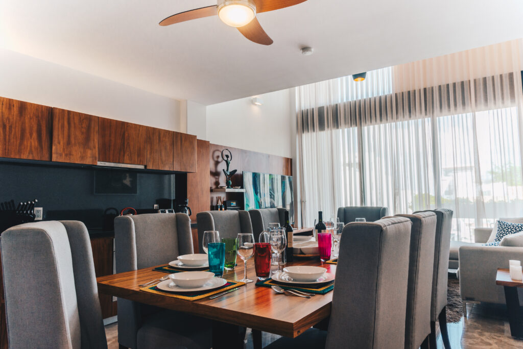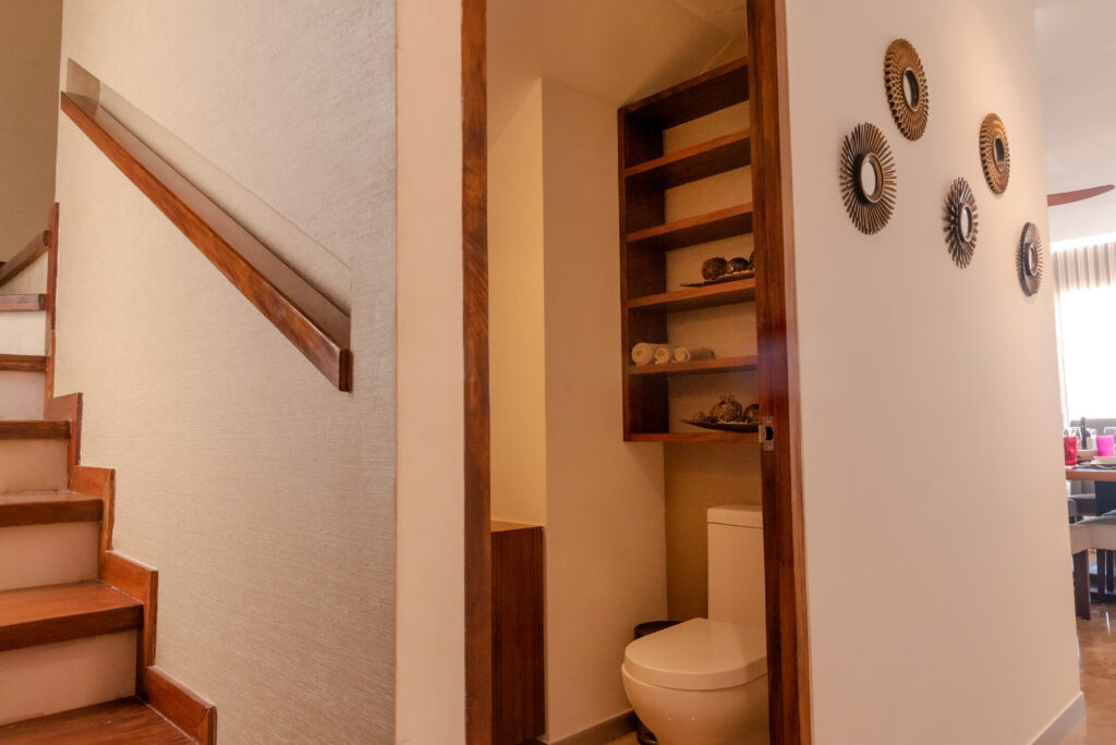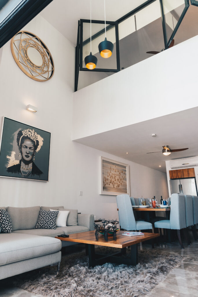 Upon entering the apartment, located on the 4th floor, you will have access to the kitchen/dining room and living room area, all fully equipped with top brand luxury appliances (LG double door refrigerator with ice and water dispenser, electric oven and stove , LG microwave with grill, 75″ SuperHD Samsung SmartTV, table and service for 8 people. You can also relax in an exclusive seating area on the balcony, overlooking 5th Avenue. This floor is completed with the laundry center ( large capacity washer/dryer with TwinWash LG system) and a service bathroom.Through a staircase you will find access to the second level, where the 3 bedrooms with private bathrooms, closets, top quality KingSize beds are located so that you can you can relax or recover energy, SmartTV SUHD 55 “, telephones and safes. The first room has a large window overlooking the room that is in the lower part, and this window is protected view of roller blind with blackout with motorized system. A long corridor will connect you, first, with the second room, this one has a window with a view of the open and green spaces of the condominium, said window has manual roller blinds with and without blackout, and finally the third room from which you will be able to contemplate the beautiful turquoise tones of the Caribbean Sea and at night, if you wish to obtain privacy you can also unfold your manual roller blinds with and without blackout. Finally, continuing down the same staircase, one floor higher you will find the private terrace, where you can enjoy with your family and friends using the heated pool (hot/cold), sunbathe on the loungers, eat at the table with spaces for 6 guests, watch satellite television on a SmartTV SUHD 55″. This space has another service bathroom to avoid the circulation of people in other areas.